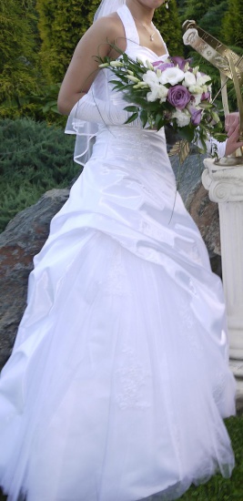 Sprzedam piękną suknie ślubną zakupioną w salonie Sarah w Rybniku. Rozmiar sukni 34/36, kolor biały wykonana z satyny królewskiej bardzo wygodna i lekka. Suknia jest jednoczęściowa z tyłu gorset sznurowany więc dopasuje się do każdej sylwetki. Po czyszczeniu chemicznym.